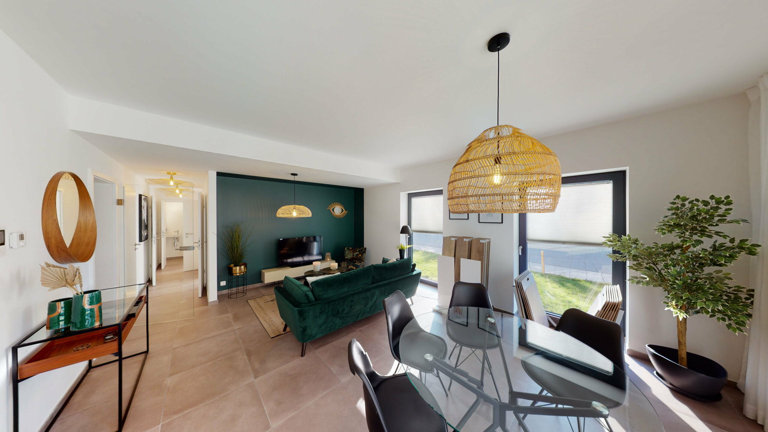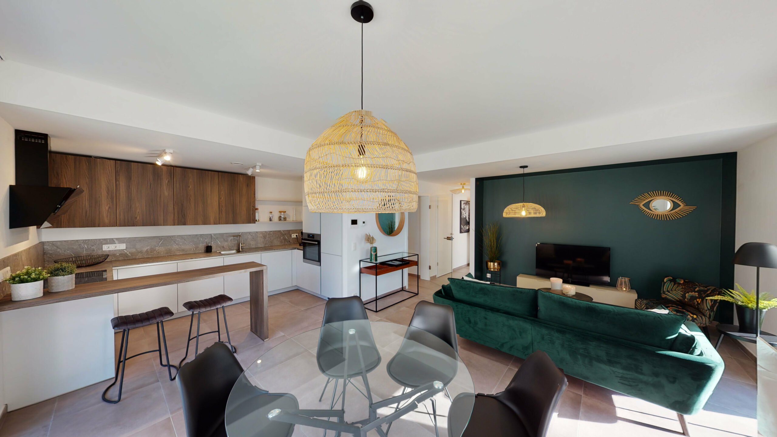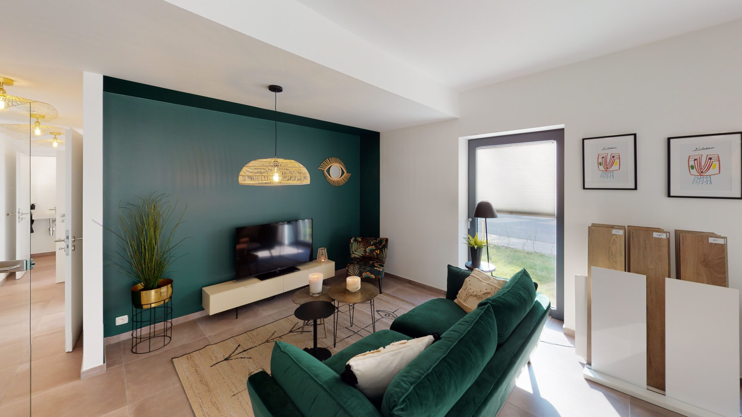Dans le cahier des charges, il fallait repositionner quelques pièces de mobilier restant d’un précédent appartement témoin. Mais en même temps, il s’agissait de recréer une ambiance différente de ce qui avait déjà été fait.